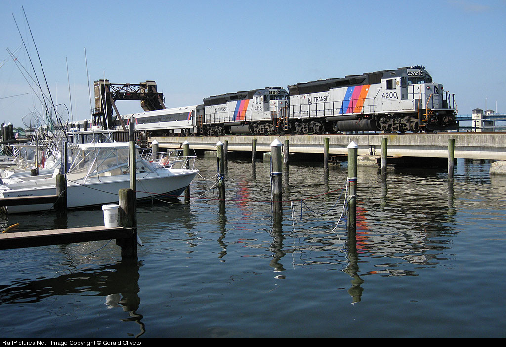 | Doubleheaded and overpowered, this six car shuttle train pushes south over the Manasquan River into Point Pleasant Beach on a beautiful summer weekend. |
