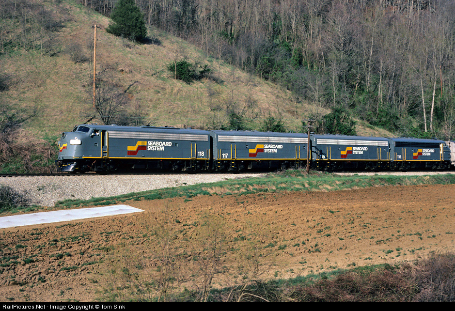 Two months before being merged into CSX the Seaboard F units lead a nouthbound passenger train near Green Mountain, NC on the present-day CSX Blue Ridge Subdivision