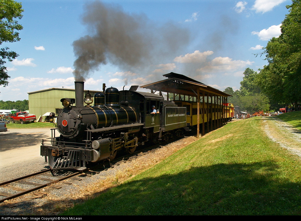 There are likely not too many US steam locos that have been active for 27 years and have never been captured for RP, this is an exception. #9 was built for the US Navy by Porter as a tank engine in 1942. She's pretty hefty as far as 0-4-0's go: weighs about 50 tons, has 45" drivers, 16x24" cylinders, and makes about 21,500 lbs. of tractive effort. She was returned to service for the annual Southeast Old Threshers reunion in 1982 looking like a completely new loco. She was converted from oil to coal, and her tank was replaced by a 2000 gal. capacity tender. Other modifications included removal of the second sand dome, major changes to the cab, and oddly the addition of a diesel-like mechanical bell under the cab.