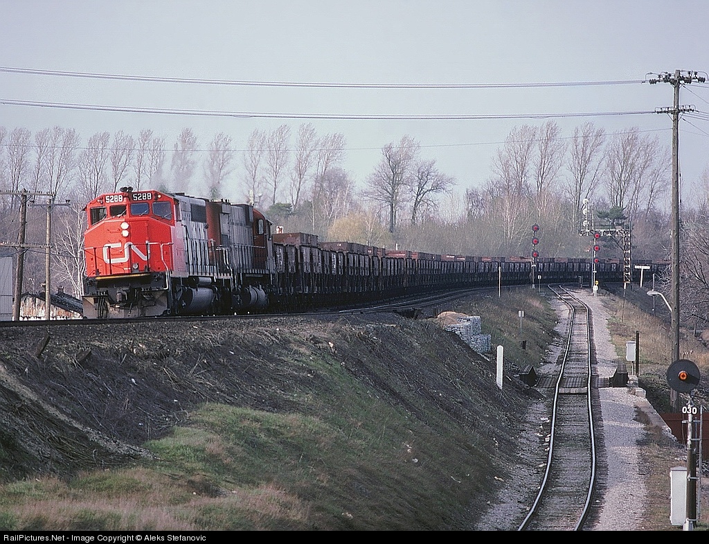 | The CN ore jennies on this 834 are loaded with slag from the nickel mining operations in Sudbury. CN was running train loads of this to be dumped in Paris for use as ballast on CN's mainlines. Powering todays train in CN 5288 - CN 2317 with 80 of these short ore hoppers with CN van 79261 on the tail end. |