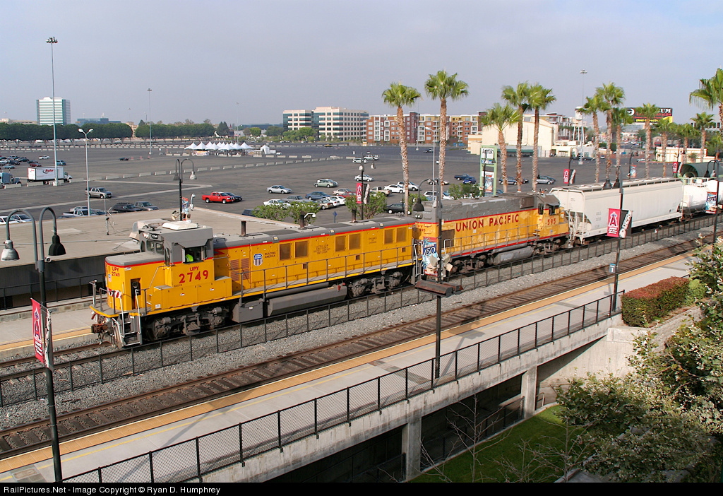 | The UP Costa Mesa local notches up the power through the Anaheim Amtrak station en-route to Santa Ana and points south. The Parking lot in the background is for Anaheim Stadium home of the Los Angeles Angels. |