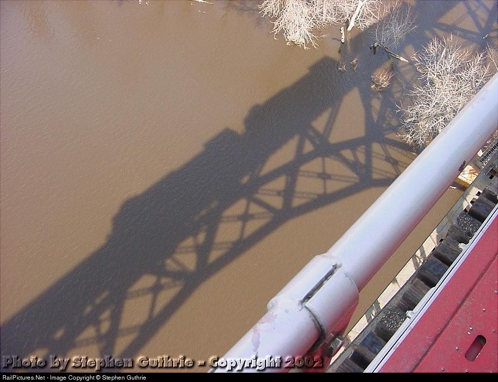 BNSF Detour trains shadow is seen in the St. Croix River 180 feet below.