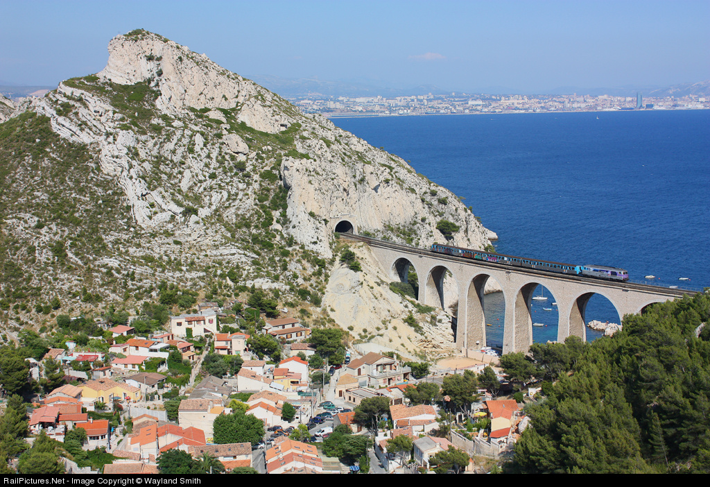 An early evening Marseille - Miramas push pull service crossing the viaduct at La Vesse.