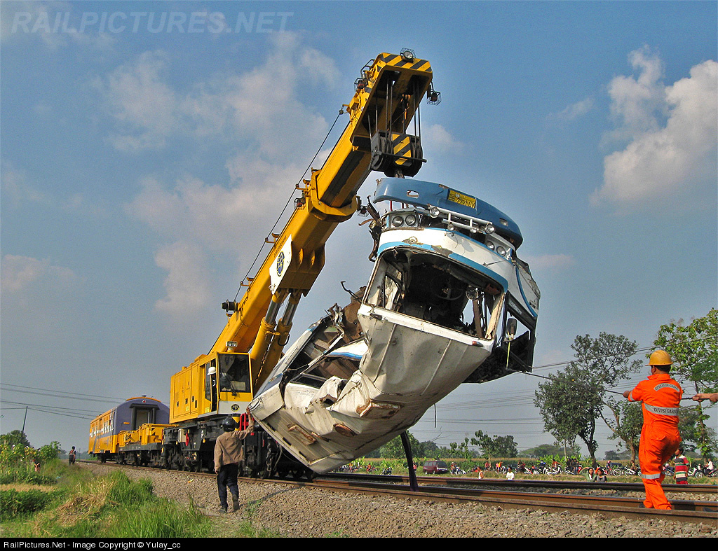 Kirow crane (known as Kumbokarno Crane) evacuated a bus wreckage. The bus hit by Prambanan Express train from Solo to Yogyakarta at about 10:00 Am. Unfortunately 15 people killed at this accident and others were injured.