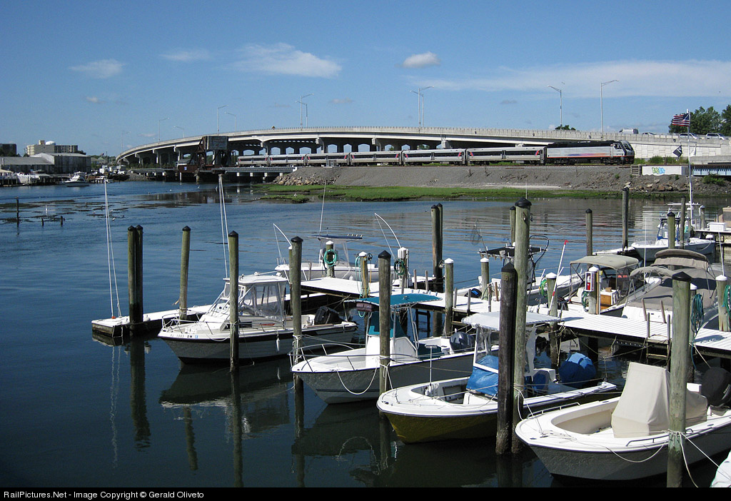 | On a beautiful Independence Day morning, this westbound shuttle train powered by PL42AC no. 4013 passes over the Shark River en route to Bay Head. |