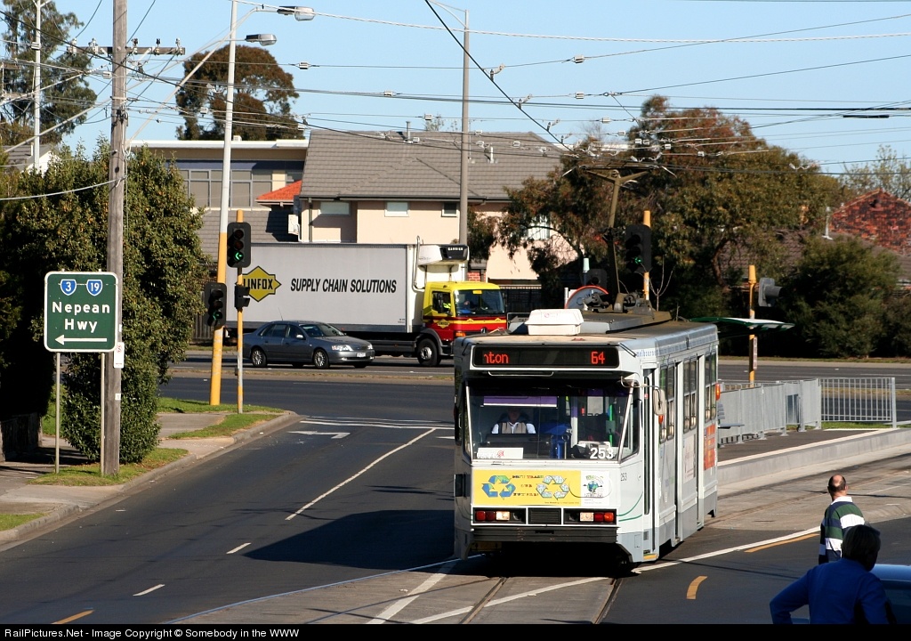 | One of only two A-class trams running on St Kilda Rd routes has just departed the world's southern most non-tourist tram stop, running on route 64 to Melbourne University. |
