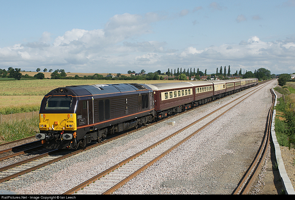 | Royal Train loco,67006, heads the 05.35 Leeds to Kensington Olympia 'Northern Belle' excursion on the outskirts of Wellingborough at Harrowden Jct. |