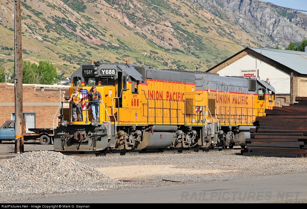 Locomotive and man power from the local maneuver in the tight, cluttered confines of the north end of the Provo Yards. The crew member on the left is controlling the power remotely. A public street, South Colorado Avenue, runs through this scene (behind these engines), separating the two yards.