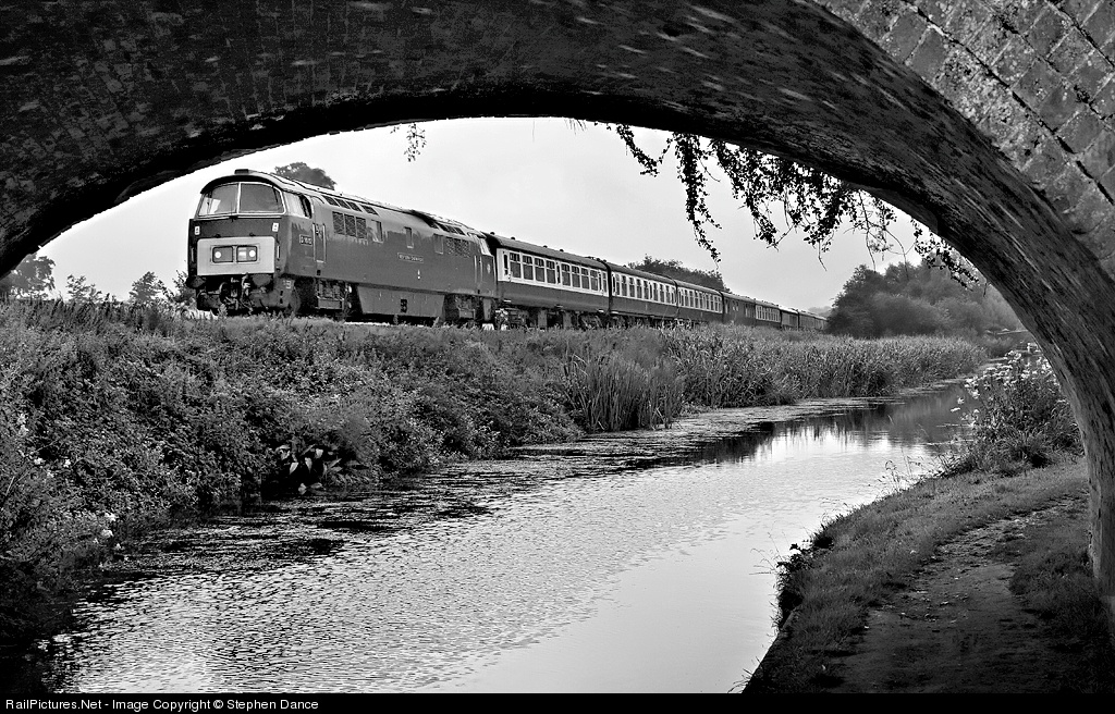 | D1015 heads a private GBRf charter from Paddington to Minehead for staff to attend a naming ceremony. It is seen here alongside the Kennet and Avon canal at Beech Grove Lock |