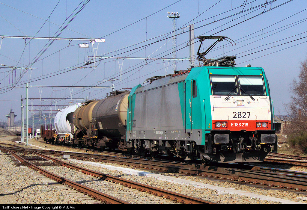 Engine 2827 (186 219) just left Moresnet yard on it's way to Aachen. The background displays the tower of Moresnet yard.
