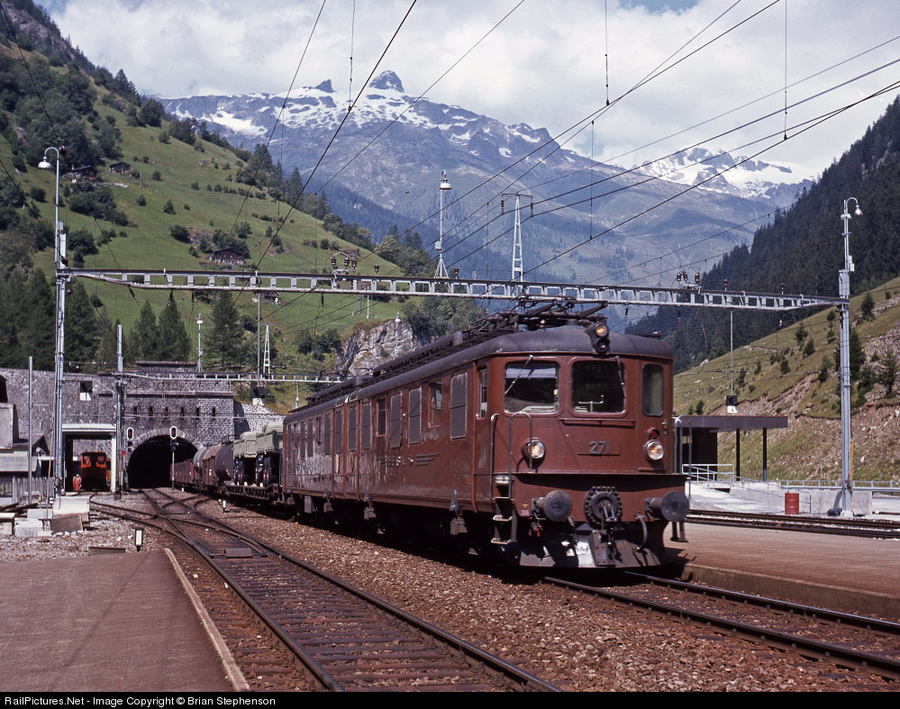 One of the five BLS double locos, No 271 built in 1959 leaves the Lotschberg tunnel at Goppenstein with a southbound freight train 32 years ago. These engines had a rating of 8,000hp for working the heaviest freight trains over the ruling gradient of 1 in 37.