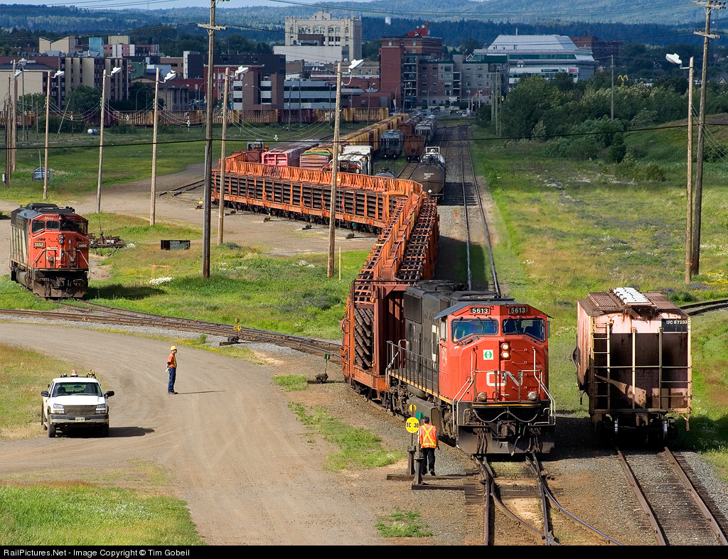 | Quite alot worth mentioning in this shot. Not too often 3 trains are seen in the mostly dead-quiet Port Arthur Yard; CN 5613 with rail train 491, train 437's light power waiting a crew on the stub track, and the extra yard job seen working the yard in the background. All of this is being observed the carman working his final shift before retirement. |