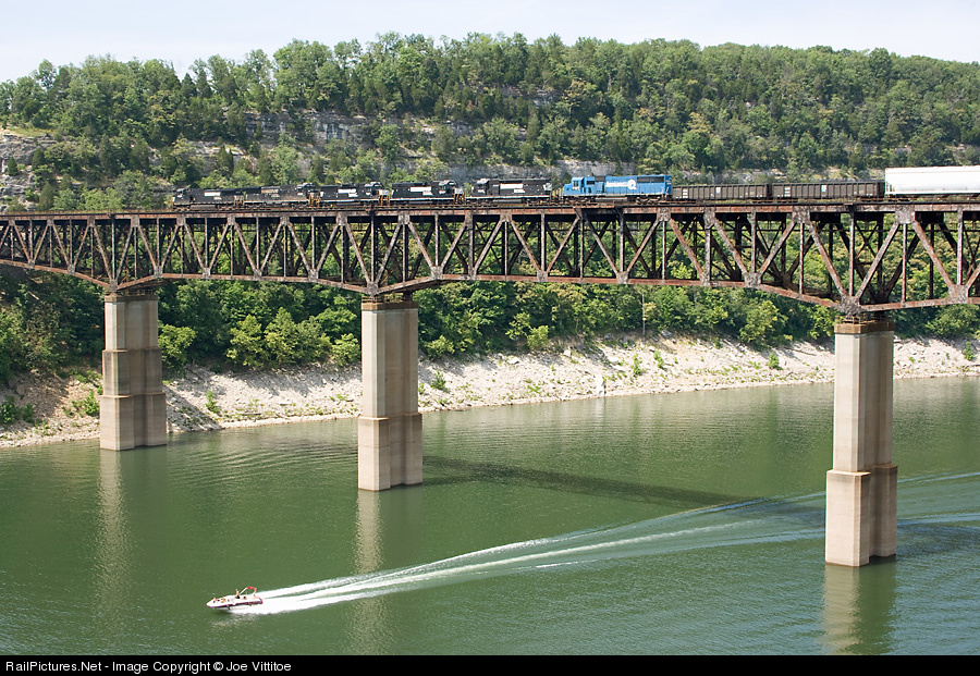 NS 144 rolls north across Lake Cumberland at Burnside as boaters enjoy the beautiful summer day.