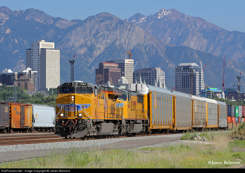 | With the rugged Wasatch Mountains as a backdrop, a Union Pacific auto/stack train combo rambles east through North Yard in downtown Salt Lake City. |