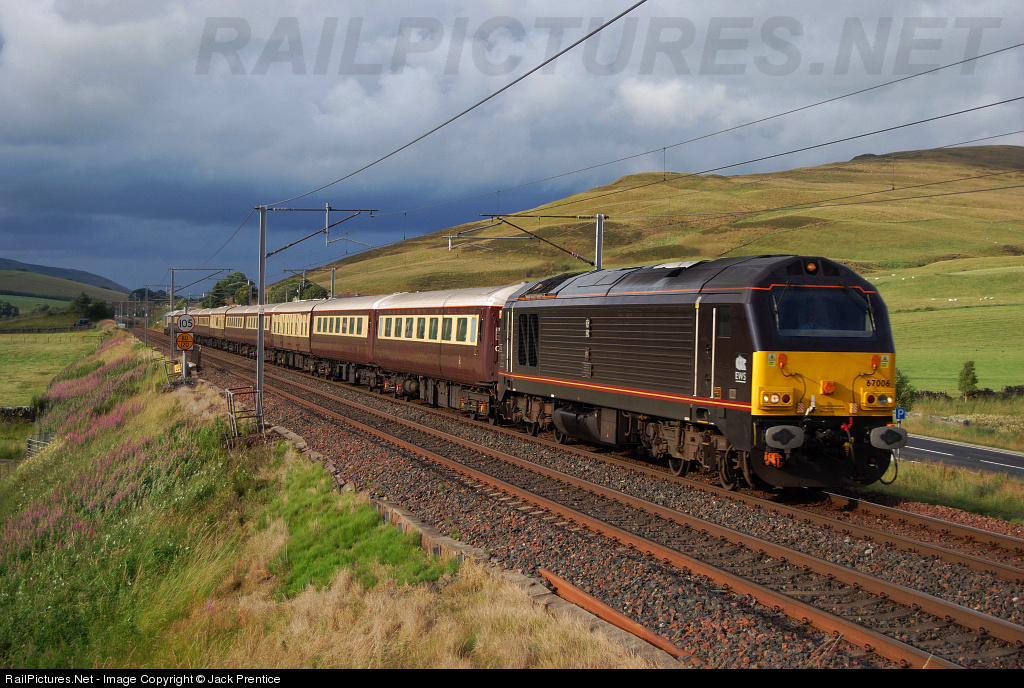 | Royal train loco 67006 ''Royal Sovereign'' leads the 1Z26 Edinburgh Waverley - Carlisle Via Glasgow Central ''Northern Belle'' with DB Executive loco 67029 ''Royal Diamond'' on the rear |