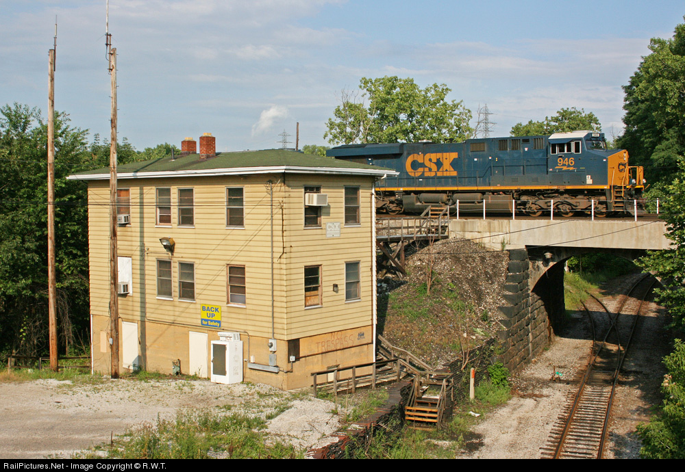 CSX train Q389-16 rolls west over the former B&O CT&V Subdivision, and past what was once the Yard Office for Akron Hill Yard. The train is lead by one of CSX's newest GE ES44AC products. The unit has the high numberboards, above the windshields, rather than down on the nose, like most of it's predecessors.