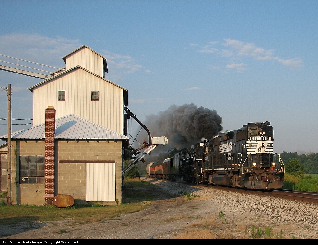 NS 098 passes the Blakeslee elevator towing NKP 765 early this morning on its way to Milan Michigan for interchange with the AA