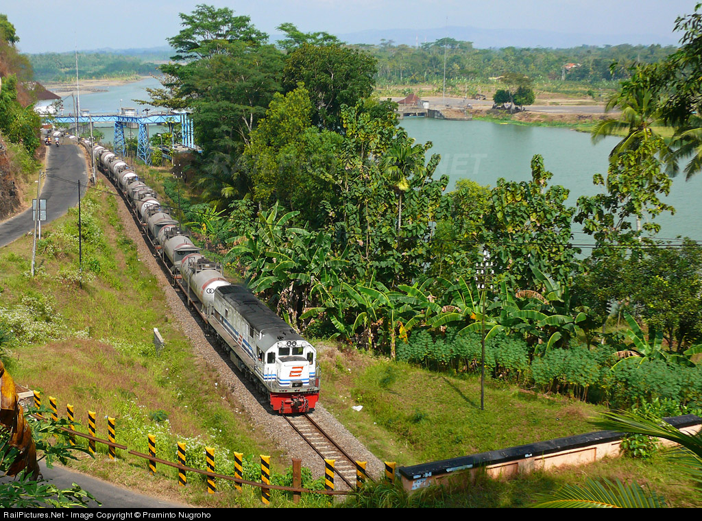 CC20170 pulls loaded tank-cars on the single track at Kebasen with Serayu river in the background. Double track will resume at Purwokerto, just north ahead.