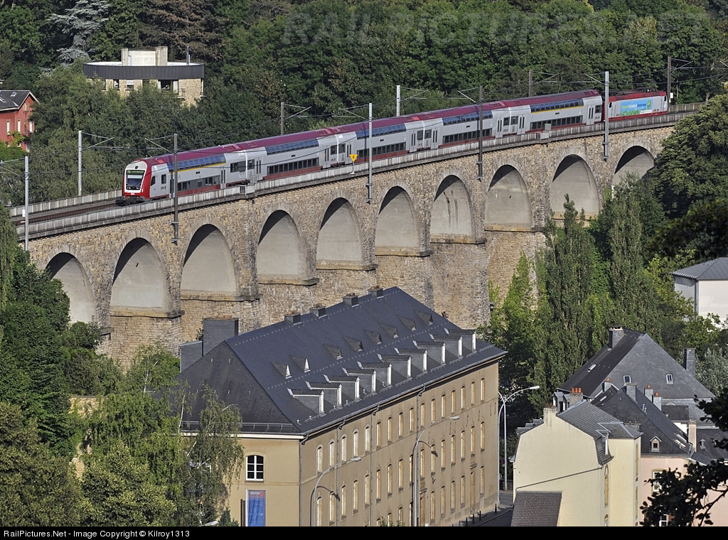 | Interregional train from Ettelbruck to Luxembourg City with electric loco #4016 and five bilevel passenger cars including cab car #005 short before arriving at Luxembourg City main station. |