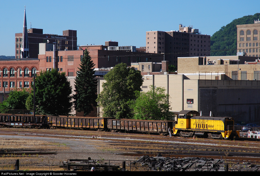 | Delivered as the 102 in 1949, the 2000 was renumbered and repainted for the third time in the year 2000 to commemorate the 200th anniversary of its home town of Johnstown. Here it works in downtown delivering a string of gons to the CSX interchange yard along Washington St. |