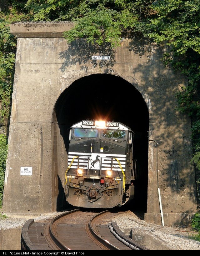 | NS 9764 pops out of the concrete lined tunnel at Hatfield, while the older adjacent tunnel is now undergoing "renovations" for the Heartland Corridor Project. |