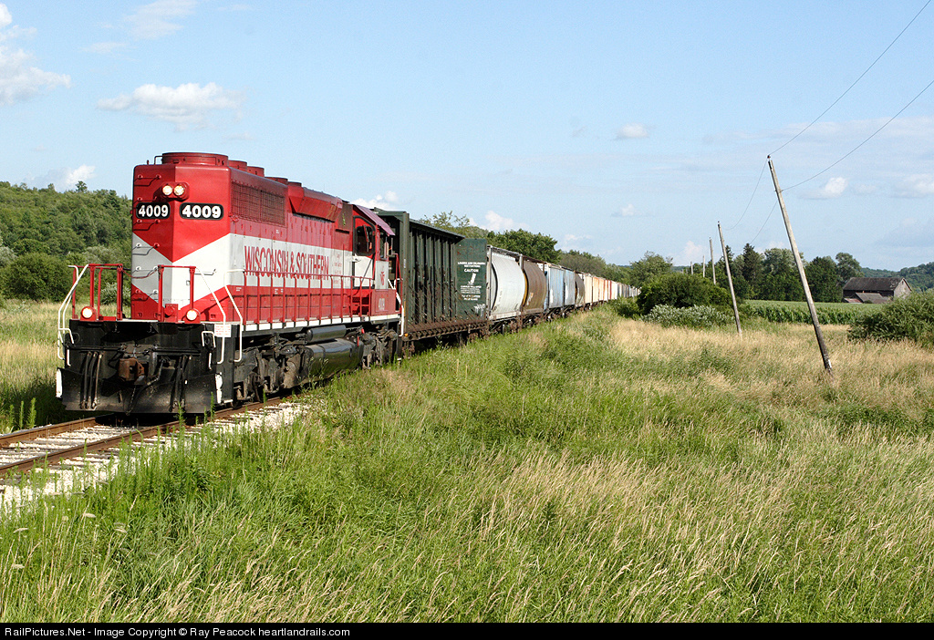 | WSOR 4009, ex Milwaukee #199, takes ex Milwaukee trackage to Prairie du Chein with a healthy cut of cars. |