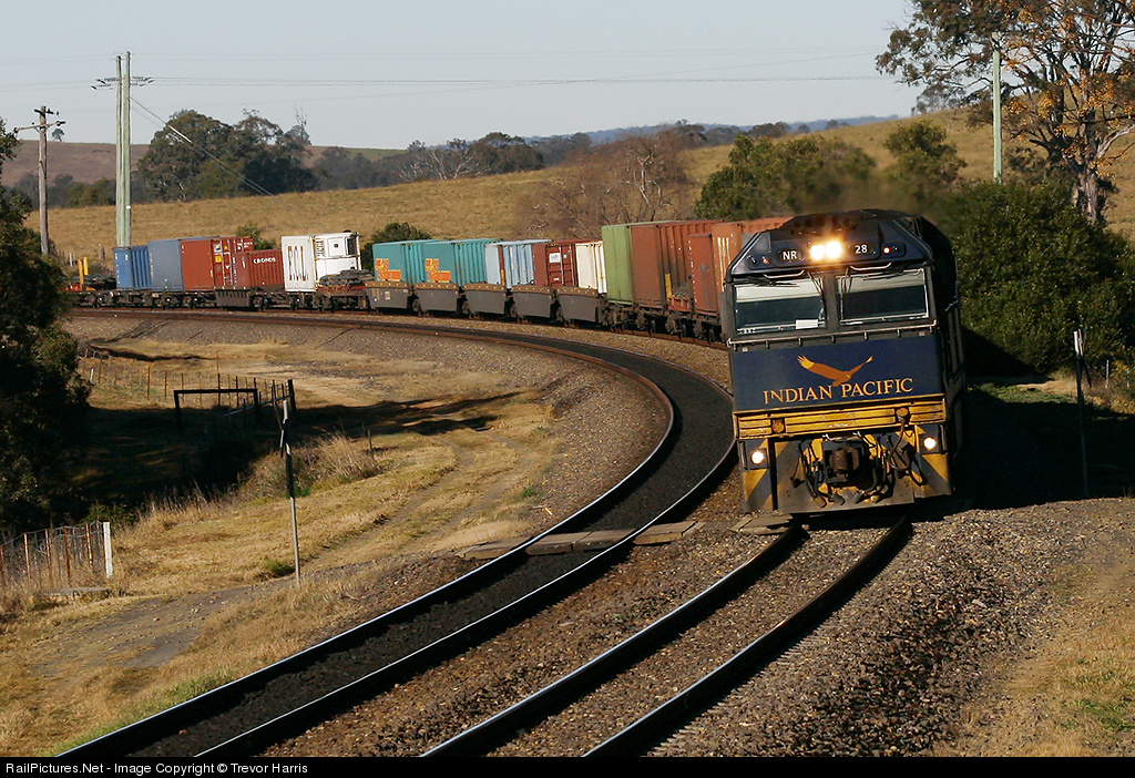 NR28 in Indian Pacific livery leeds NR60, NR15 on an early morning Melbourne to Brisbane PN freight through Maldon.