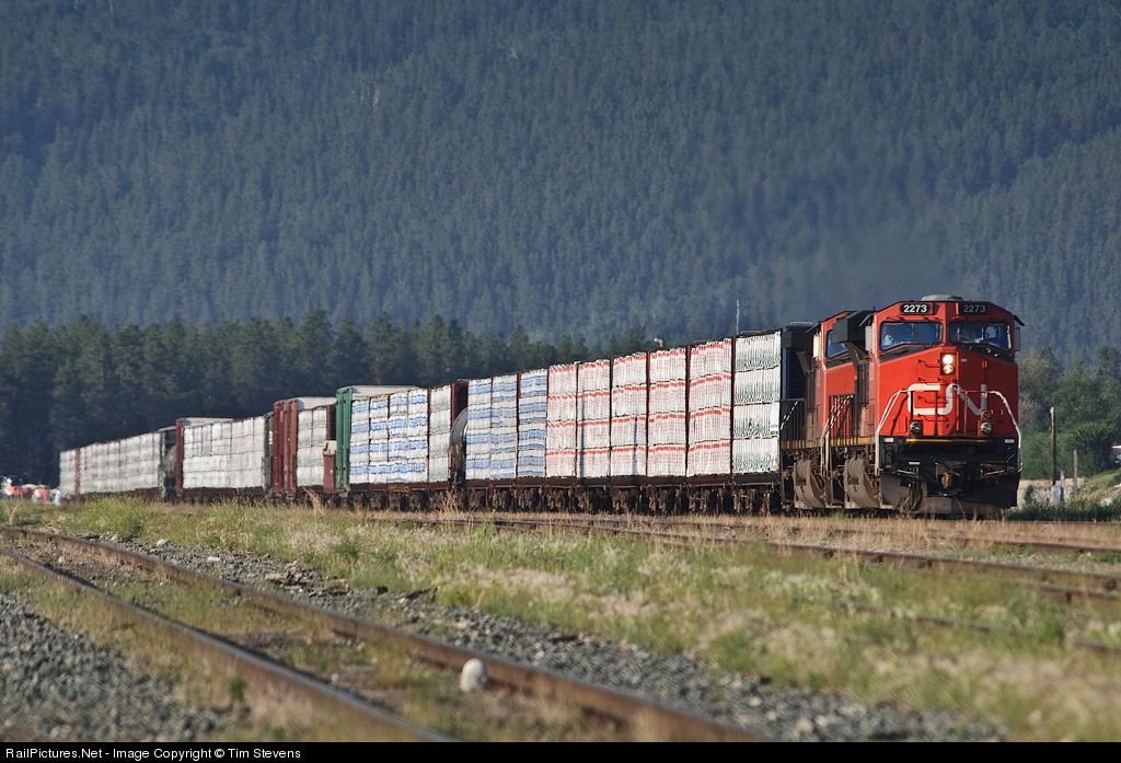 CN 2273 pulls one of two daily lumber loads east out of Jasper Yard, via track 8.