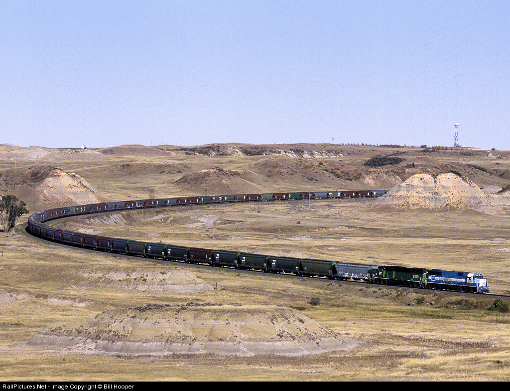 A Westbound grain train descends the Fryburg Hill into the Little Missouri Badlands on BNSF coal line across North Dakota, former NP