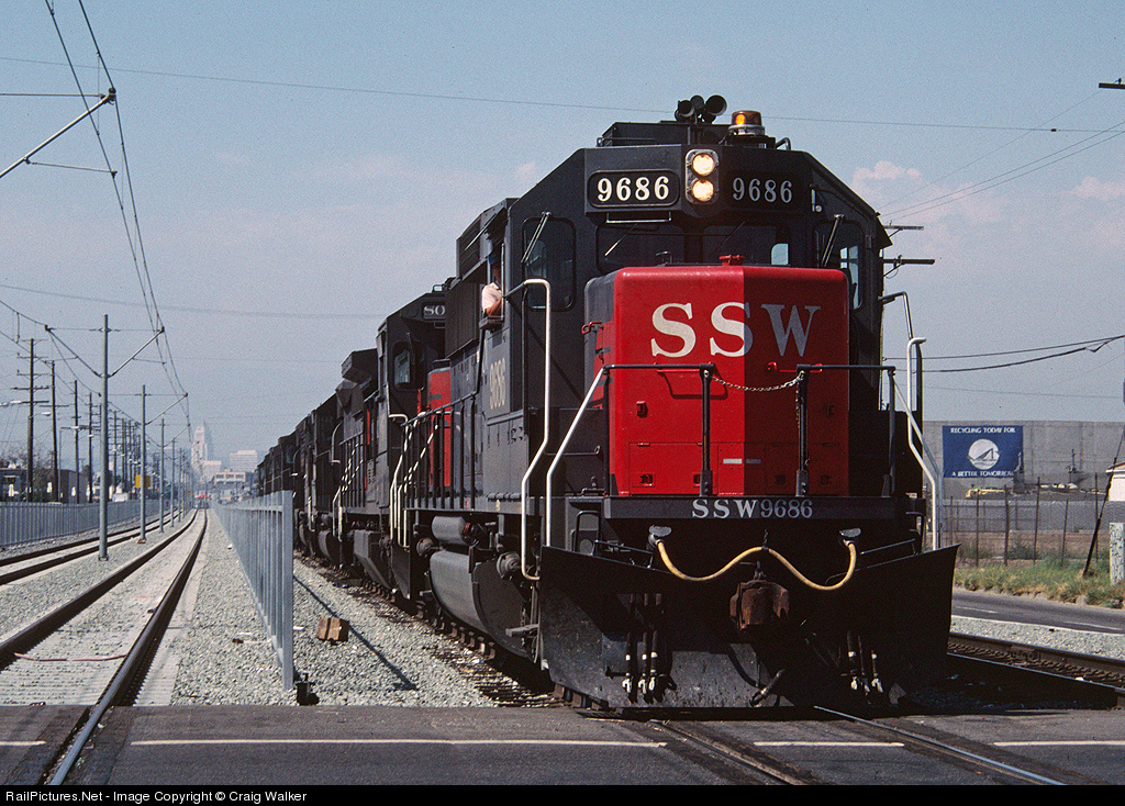 With Los Angeles' City Hall visible in the distance, Cotton Belt GP60 9686 leads a light power movement southbound (railroad "east") on Southern Pacific’s Wilmington Line, alongside the new MTA Blue Line light rail trackage, the old Pacific Electric four-track mainline (which I rode the last week the PE operated it) running down the middle of Long Beach Blvd to downtown LA. This power is headed to Dolores Yard, not far from the Los Angeles and Long Beach ports, and the Blue Line will be paralleled all the way. (Los Angeles, California - August 11, 1990)