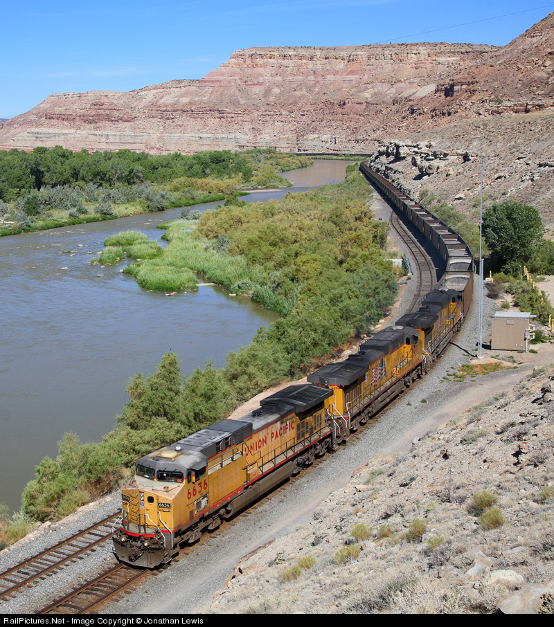 | UP 6636 is seen leading eastbound coal empties at Bridgeport, Colorado following the Gunnison river - 05/09/2008 |