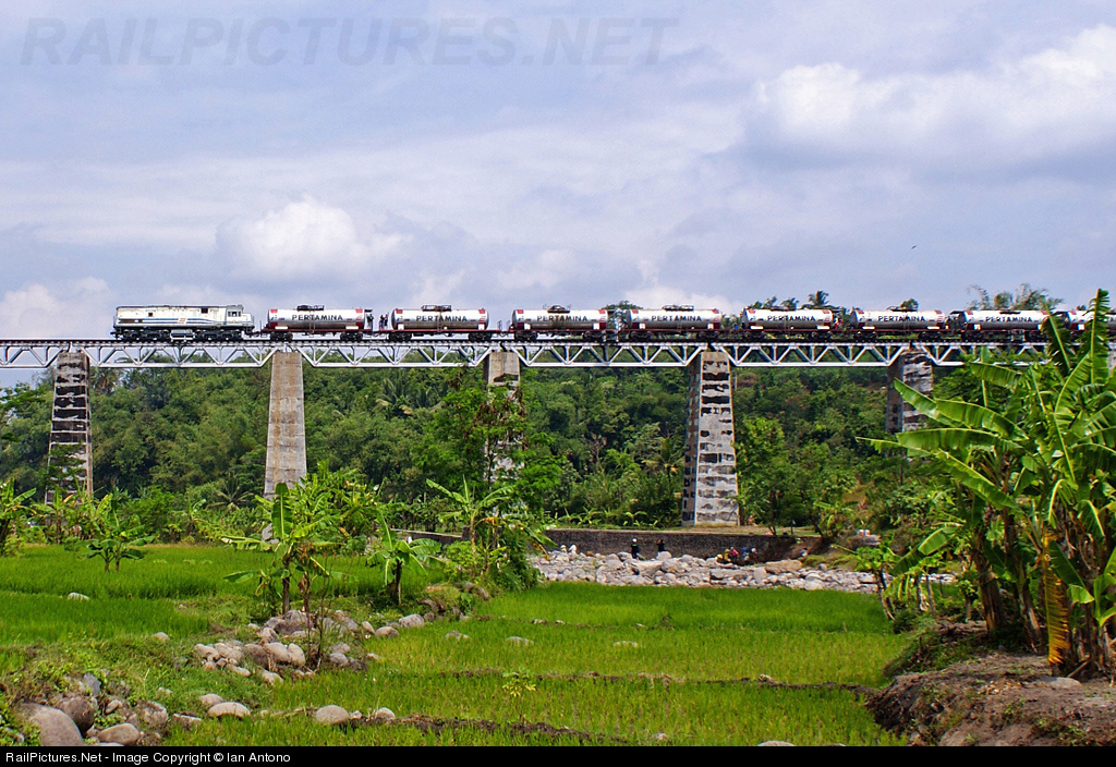 | The GE Loco hauled empty-tanker wagons, passing in the SaKaLibel Bridge. I don't know the serial number of the Locomotive. However, it will not reduce the beauty of the Earth in Indonesia. I like it. Welcome to enjoy the beauty of Indonesian Railways. |