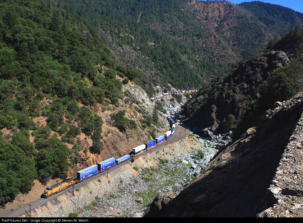 | An Eastbound struggles upgrade through Pulga after losing it's rear DPU. They'd soon go into the siding at Pulga to meet two West, and to figure out the issue with the GEVO on the rear. |