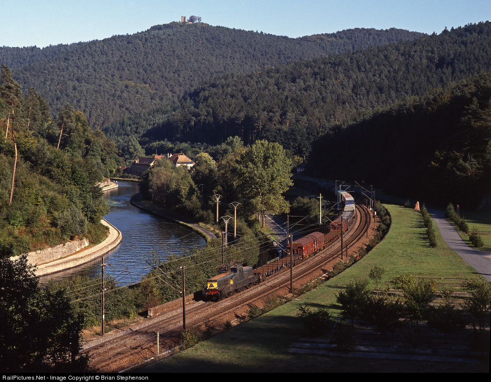 | One of the SNCF 'Monocabine' Bo-Bo electrics, now all withdrawn, has just passed the closed station at Stambach with a northbound freight train on the Strasbourg to Metz main line. It is running through the Vosges hills beside the Marne-Rhein Canal. This line was part of the Alsace-Lorraine Railway and came under German control hence the right-hand running still adheared to in Eastern France. |