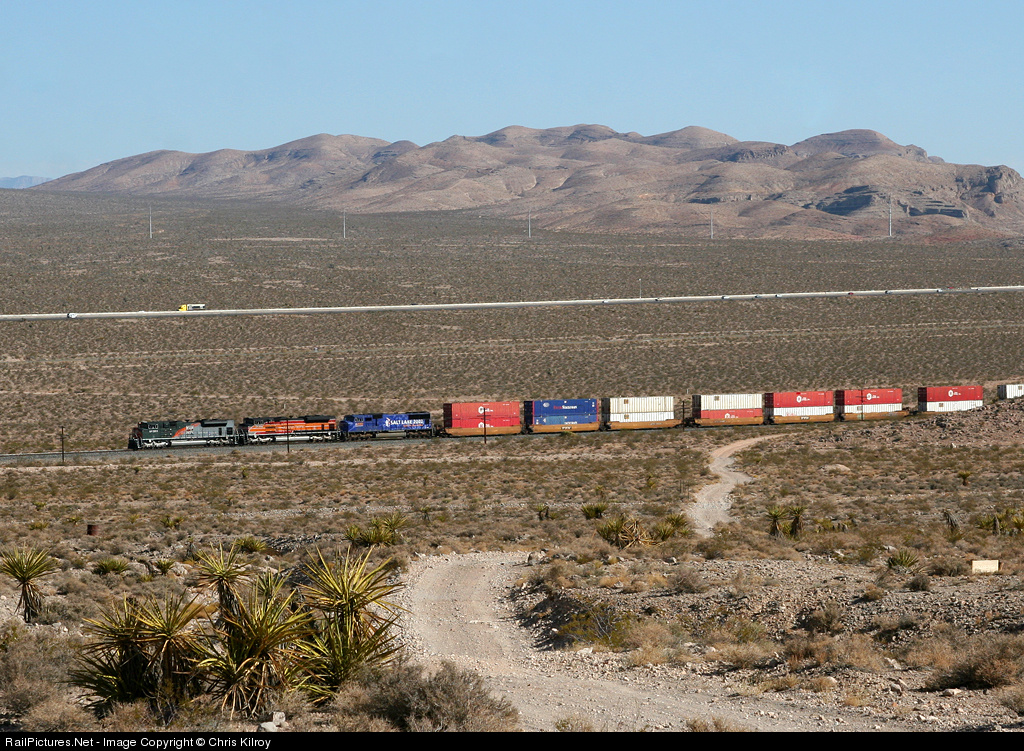 UP's KG1LA "monster" stack train (11,766ft, 162 cars) heads westward on a beautiful desert morning with an outstanding consist in charge. Leading the pack is Western Pacific heritage unit 1983, followed up by Southern Pacific heritage locomotive 1996, and finally UP 2002 which commemorates the 2002 Salt Lake City winter Olympics. This behemoth also featured two mid-train DPUs which were in standard UP livery, and can be seen in this photo.