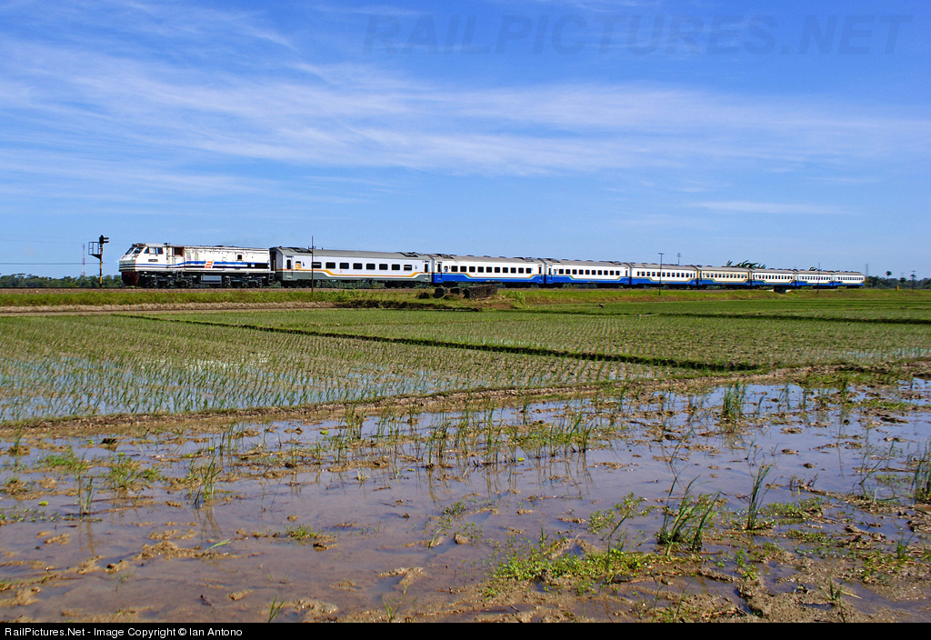 | CC20413 "The New GE Loco Power" leads Lodaya Express and heading westbound to Solo, through a vast carpet of rice fields in the Kasugihan-Cilacap, which the rice crops just planted by farmers. It was a lovely daylight with clear and blue sky towards the afternoon. That illustrates how the beautiful natural scenery in Indonesia. I like it. |