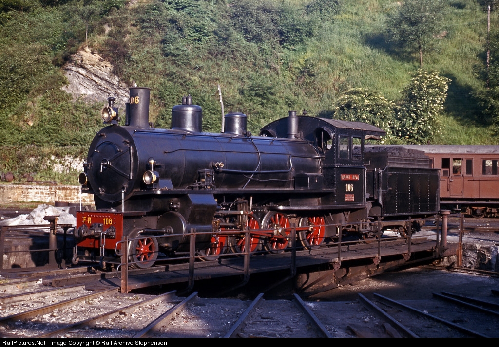 Another exiled Swiss locomotive, former RhB 2-8-0 No 106 'Manuel Oraa' is seen on the La Robla railway turntable at Valmaseda. The metre gauge La Robla purchased seven of these engines keeping their original RhB numbers. Four of them, Nos 102, 104-106 were two cylinder compounds and the other three, Nos 109-111 were simples. Nos 107 & 108 remain with the RhB and are well known for their steam excursions on that line. Two others, Nos 101 and 103 went to Brazil while Nos 112-129 went to the Royal Thai State Railway where No 123 still survives as a museum piece. The 29 engines were all built by SLM Winterthur in 1904-15.