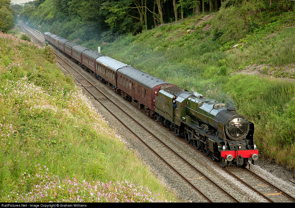 | The light is disappearing as Royal Scot Class no. 46115 Scots Guardsman heads through the deep cutting at Hoghton Bottom with the returning Fellsman main line special from Lancaster to Carlisle. |
