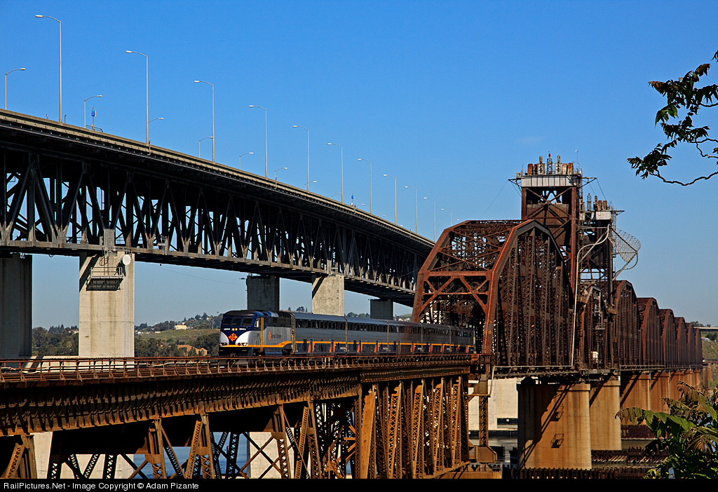 | On a warm spring morning an Amtrak Capital train is heading westbound on the ageing bridge that spans the bay. Not long after this train passed, famed UP steamer 844 crossed the bridge headed for Oakland as well. |