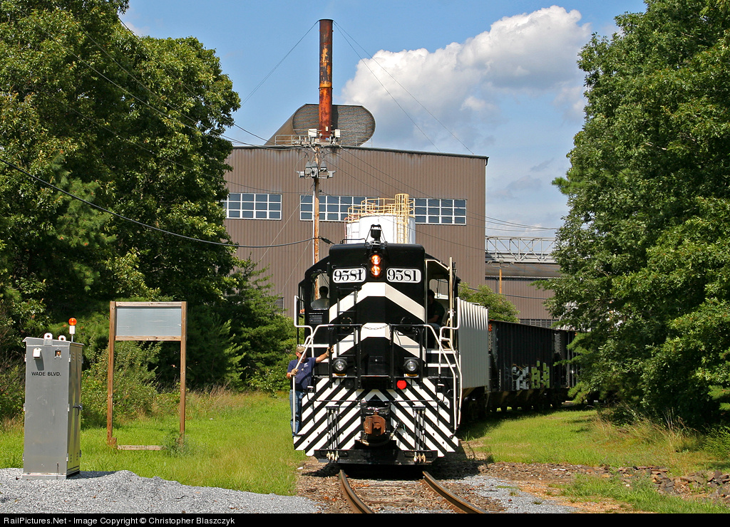 | The Durand Glass plant looms in the background as Black River & Western SD9 9581, on lease to the Winchester & Western, slowly pulls out of the property and across Wade Boulevard after finishing its switching chores. |