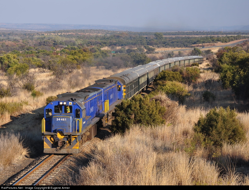 Privately owned Rovos Rail operate their "Pride of Africa" luxury train safaris from their home base in Pretoria, to several destinations in Southern Africa. The bushveld that is so typical of this part of South Africa, stretches all the way to the horizon as Rovos' train from Victoria Falls in Zimbabwe, approaches the N4 highway bridge west of Swartruggens, behind a pair of Transnet Freight Rail class 34 diesels.