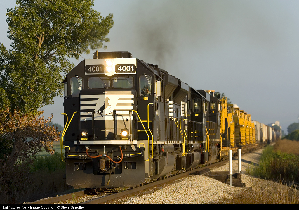 Norfolk Southern 4001 and 4000, are returning from Peoria and meeting a morning sunrise at Carlock, Illinois. The two Progress Rail PR43C's are making a first run paired together, Caterpillar power pulling Caterpillar tractor loads!