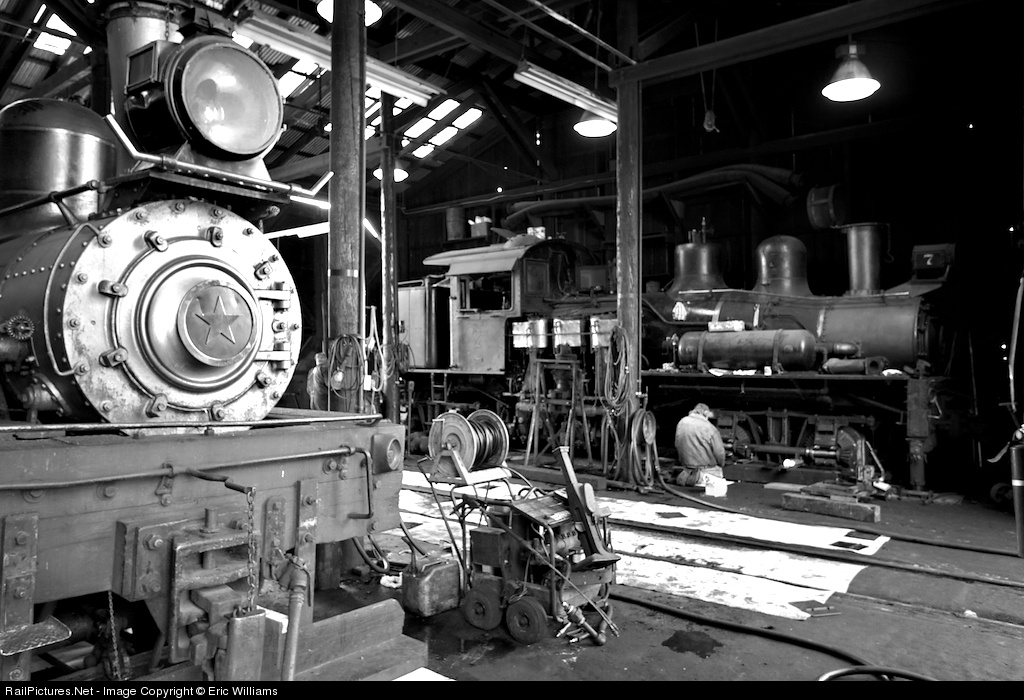 A lone machinist prepares Shay #7 for the upcoming season while Shay #1 stands proud.