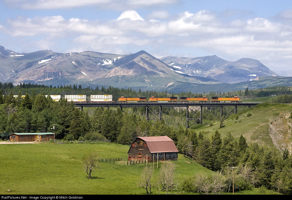 | BNSF 5377 leads an intermodal train Eastbound over the famous Two Medicine Bridge named for the river beneath it. Why is the river named so? That remains a mystery though it has been said there may have been a clinic on each side of the river, or possibly it was simply the Indian name for the area that became pronounced and accepted differently at the time of it's establishment. |
