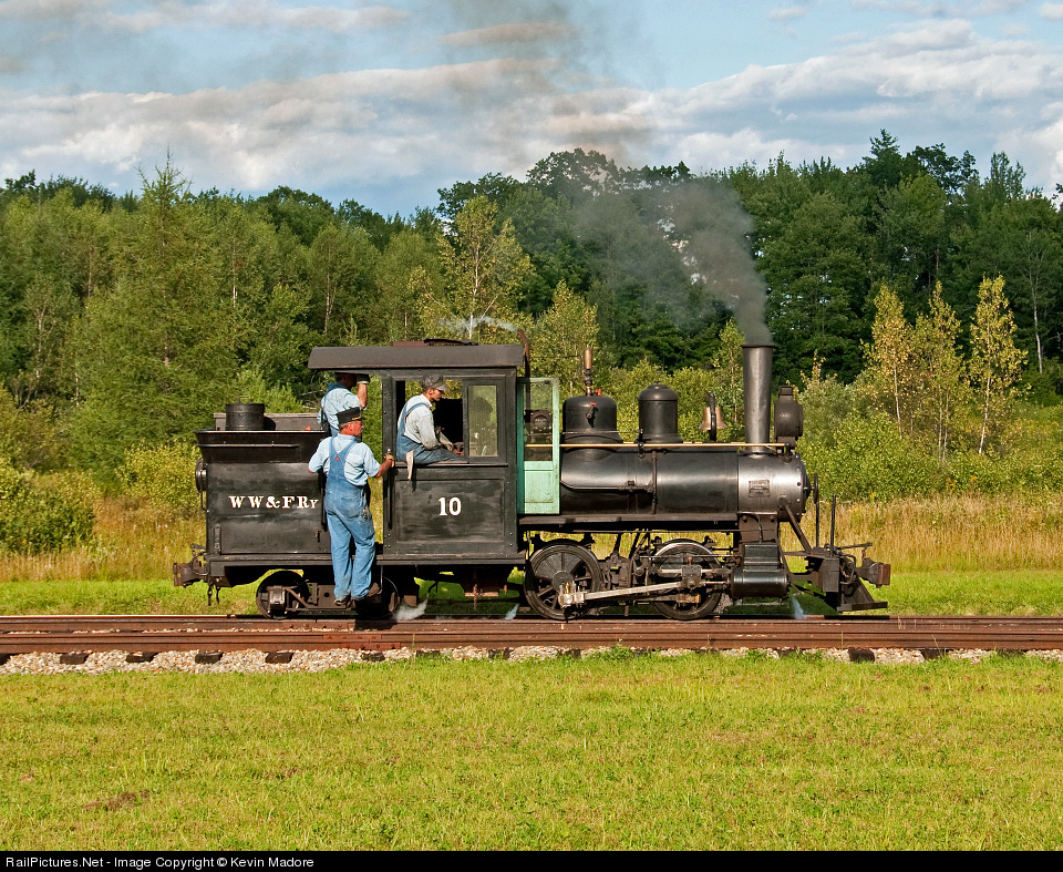 A WW&F crew takes Locomotive #10 down the passing track at Alna Center to run around the train for the trip back to Sheepscot Station. Old Number 10 is a 12-ton Forney that was built back in 1904 by the Vulcan Iron Works. She was originally a 30" gauge engine, designed to work the sugar cane fields. In the mid 1900s, she was acquired by Ellis Atwood and regauged as a 2-footer for use at his Edaville Railroad attraction in Massachusetts. There, she proved too small for most of the trains and saw little use. In the late 1990s, when the fledgling Wiscasset, Waterville and Farmington Railway Museum began looking for their first steam engine, she was an ideal fit. The museum bought her and totally reconditioned her. She's been plying the line ever since and has proved economical and reliable. In the next couple of years, the museum expects to add a second locomotive....an original WW&F engine that is currently under restoration.