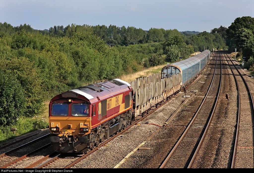 | The evening light is just beginning to glow as 66 177 approaches Basildon with 6M58 the Southampton - Bescot car transporters. This 66 has received cab modifications in order to improve driver comfort after numerous complaints about excessive noise and temperatures. This includes painting the cab roofs white in a crude attempt to reflect the suns heat |