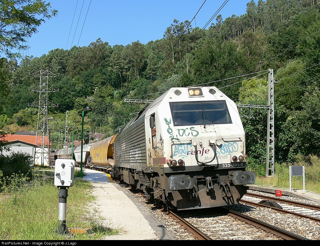 | Freight train with chutes of cereal from Marin to Taboadela passing the amazing landscape of Frieira town with the powerful diesel locomotive 333.3 rebuilt by Vossloh. |