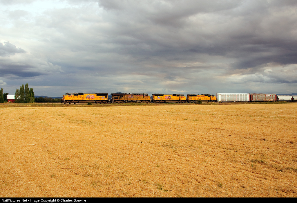 "Simply Contrastic!" UP 5039, 5383, 4808 and 4037 pass sun-lit grass seed fields as clouds and field-burning smoke fill the skies over the eastern Willamette Valley. Autoracks PW 100034 and SP 516442 roll by in stark contrast to each other, as each are respective examples of the newest and oldest autoracks rolling on Class I rails.