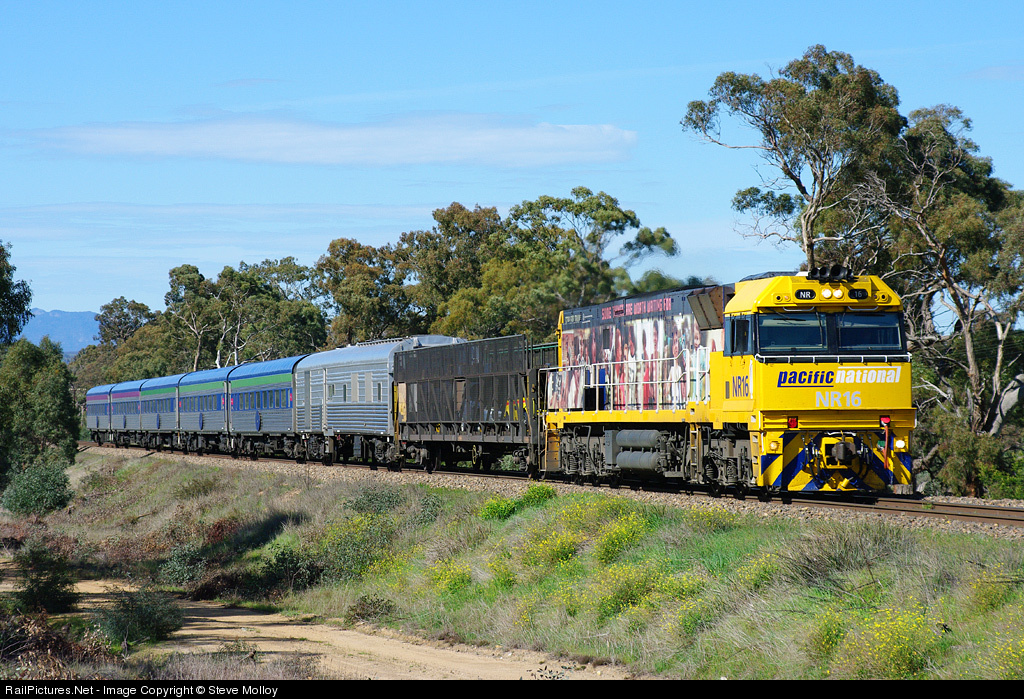 | Wearing it's special livery to promote level crossing safety, NR16 on Great Southern Railways "Overland" service from Melbourne to Adelaide, as it passes through Great Western, in Victoria's west. |