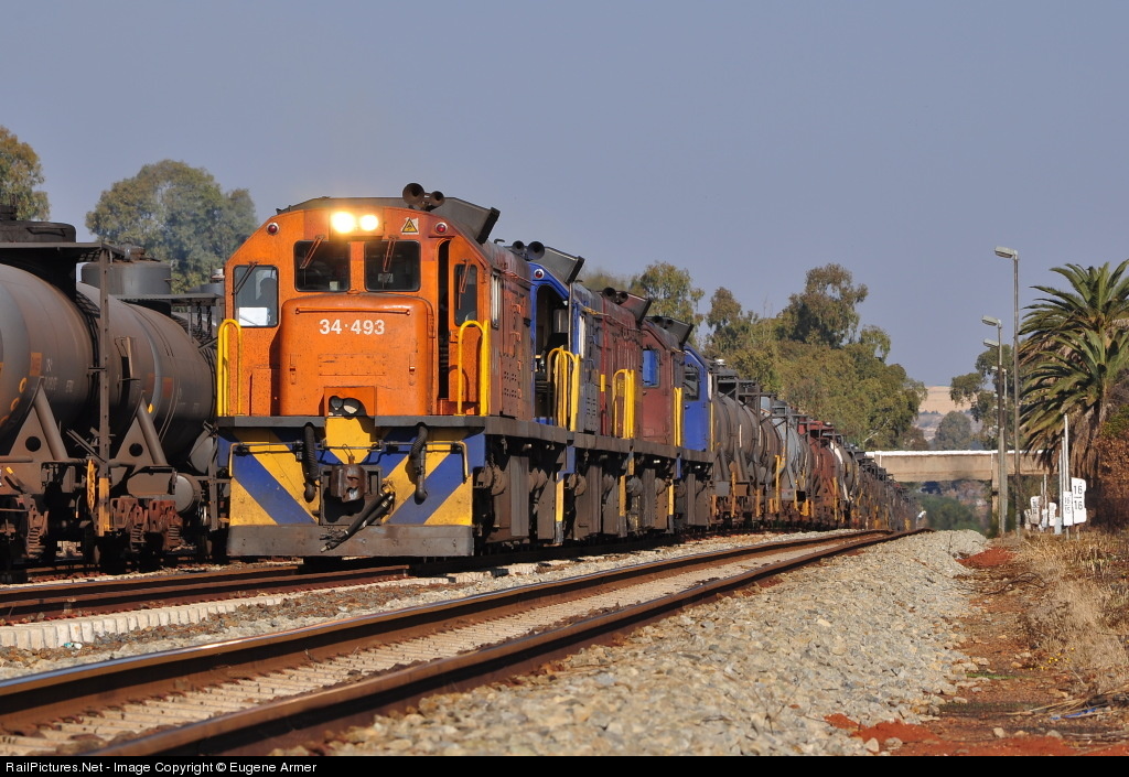 | A lash-up of four GE class 34's is ready to depart from Tarlton station with 36 loaded fuel tankers, bound for Botswana. These locomotives will take the train as far as Mafikeng, where Botswana Railways power will take over. |